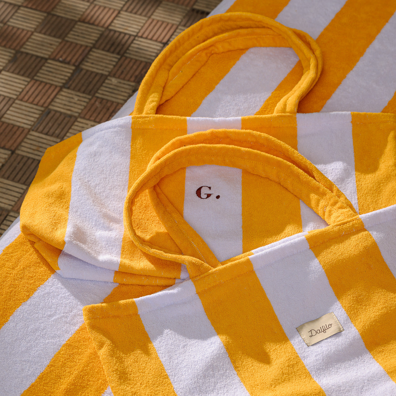- Sac de plage Portofino: 47 × 50 × 19 cm, non doublé, spacieux et léger, avec anses en éponge assorties, étiquette Dalfilo sur le devant et broderie personnalisable au dos.